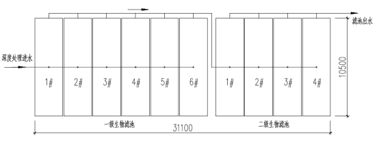 5、總平面布置深度處理生物濾池采用鋼制模塊化裝備,一級生物濾池模塊分為1-6組,二級生物濾池模塊分為1-4組,底部進水,穿越濾料層從上部出水,兩級生物濾池模塊總平面布置如下圖2。