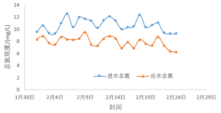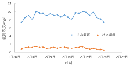溫度對硝化菌的活性影響較大,當12月-2月期間,冬季水溫低于12℃時,污水廠原A2O生化處理系統硝化速率下降,因此進入深度處理系統NH3-N濃度較高,在TN濃度中占比也較高。針對NH3-N超標,深度處理需強化硝化,采用模式一運行:1-6#一級生物濾池開啟曝氣進行硝化,1-4#二級生物濾池根據需要投加少量碳源,保證出水NH3-N、TN穩定達標。硝化濾池濾速6.3m/h,反洗周期約60-72h;反硝化濾池濾速9.4m/h,反洗周期約36-48h。碳源投加采用“模糊控制”法,通過進水流量計、進出水在線硝態氮濃度儀的反饋,建立數學模型,動態控制碳源加藥量。在保證出水COD、BOD5達標的前提下,精確的控制總氮的去除。以2月份運行數據為例,平均水溫8℃,深度處理系統進水NH3-N為7-10mg/L,進水TN為9-13mg/L,出水NH3-N≤1.5mg/L,出水TN≤10mg/L。