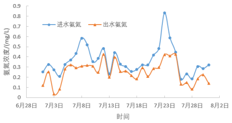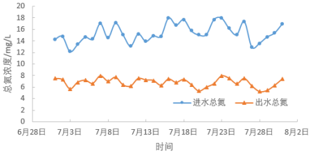 (2)夏季總氮超標運行模式夏季降雨量大,集中在7月-8月期間,雨污合流使污水廠進水有機物濃度偏低,硝化效果較好,但碳氮比較低限制了反硝化的脫氮效果,通過在原生化處理增加碳源,但利用率較低,脫氮效果得不到明顯改善,原A2O出水TN濃度偏高,大部分均為硝態氮。針對TN超標,深度處理需強化反硝化,以模式二運行為主:1-6#一級生物濾池不開啟曝氣并投加碳源作為反硝化濾池,去除硝態氮,1-2#二級生物濾池根據氨氮濃度決定是否開啟曝氣進行硝化補充,3-4#二級生物濾池不曝氣作為過濾濾池,更好地保證出水效果。反硝化濾池濾速6.3m/h,反洗周期約36-48h;硝化濾池濾速9.4m/h,反洗周期約60-72h。以7月份運行數據為例,水溫約23-25℃,深度處理系統進水NH3-N為0.2-0.9mg/L,進水TN為12-18mg/L,出水NH3-N≤0.5mg/L,出水TN≤8mg/L。